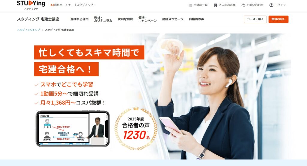 | 特徴 | スマホ完結で過去問を理解重視で学べる宅建対策講座 | 初学者にも配慮した講義と教材で段階的に学べる宅建講座 | 映像講義と出版ノウハウを活かした教材と手厚い学習支援体制を提供する | AI分析と細切れ動画で日常の空き時間に対応する宅建オンライン学習サービス | 合格点主義とフルカラーテキストで短期集中学習を支える宅建通信講座 |